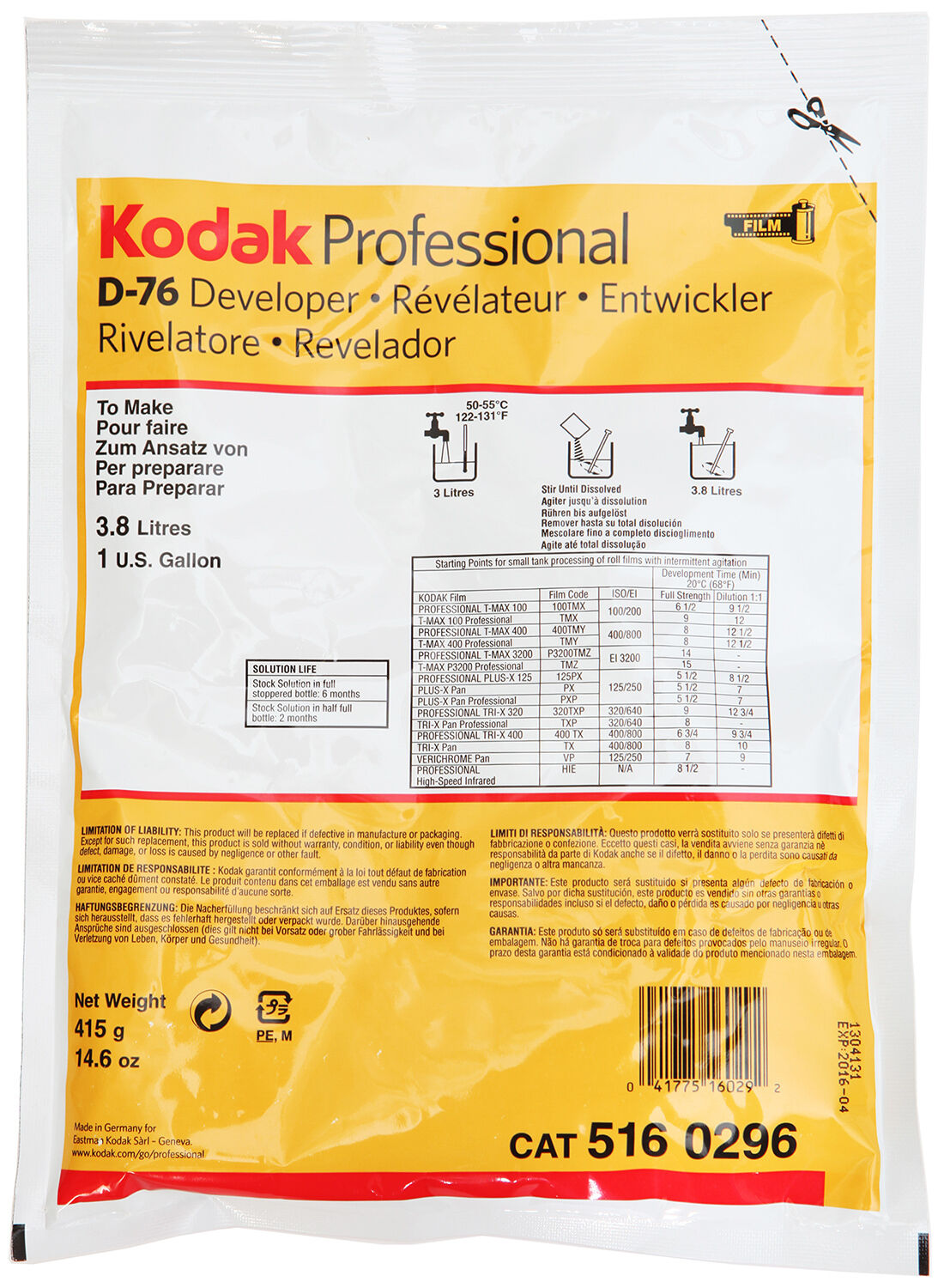 EAN 0041771058272 - sviluppo in polvere per pellicole bianco e nero per fare 3.8lt - codice produttore 5160296
