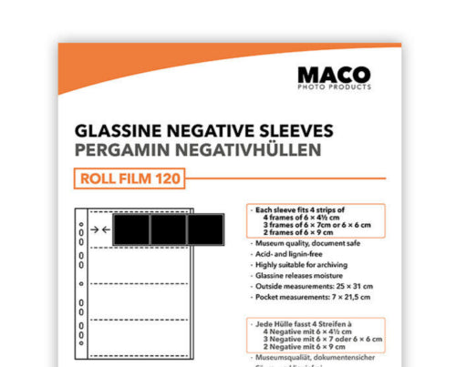 Pergamino - foglio singolo portanegativi formato 120 - ogni foglio contiene 4 striscie da 3 fotogrammi - con fori per raccoglitore ad anelli - raccoglitore ad anelli non incluso